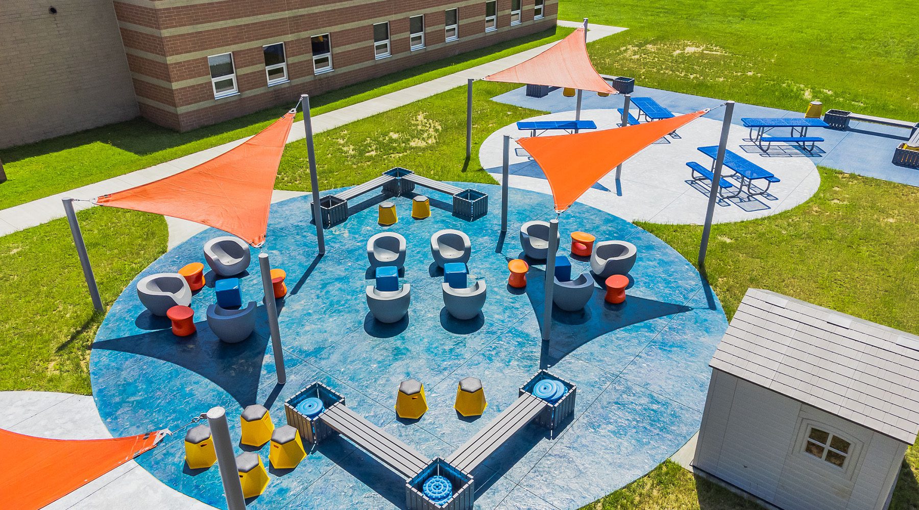 Flexible outdoor seating with shade structures creates purposeful spaces where nature-based learning comes to life.