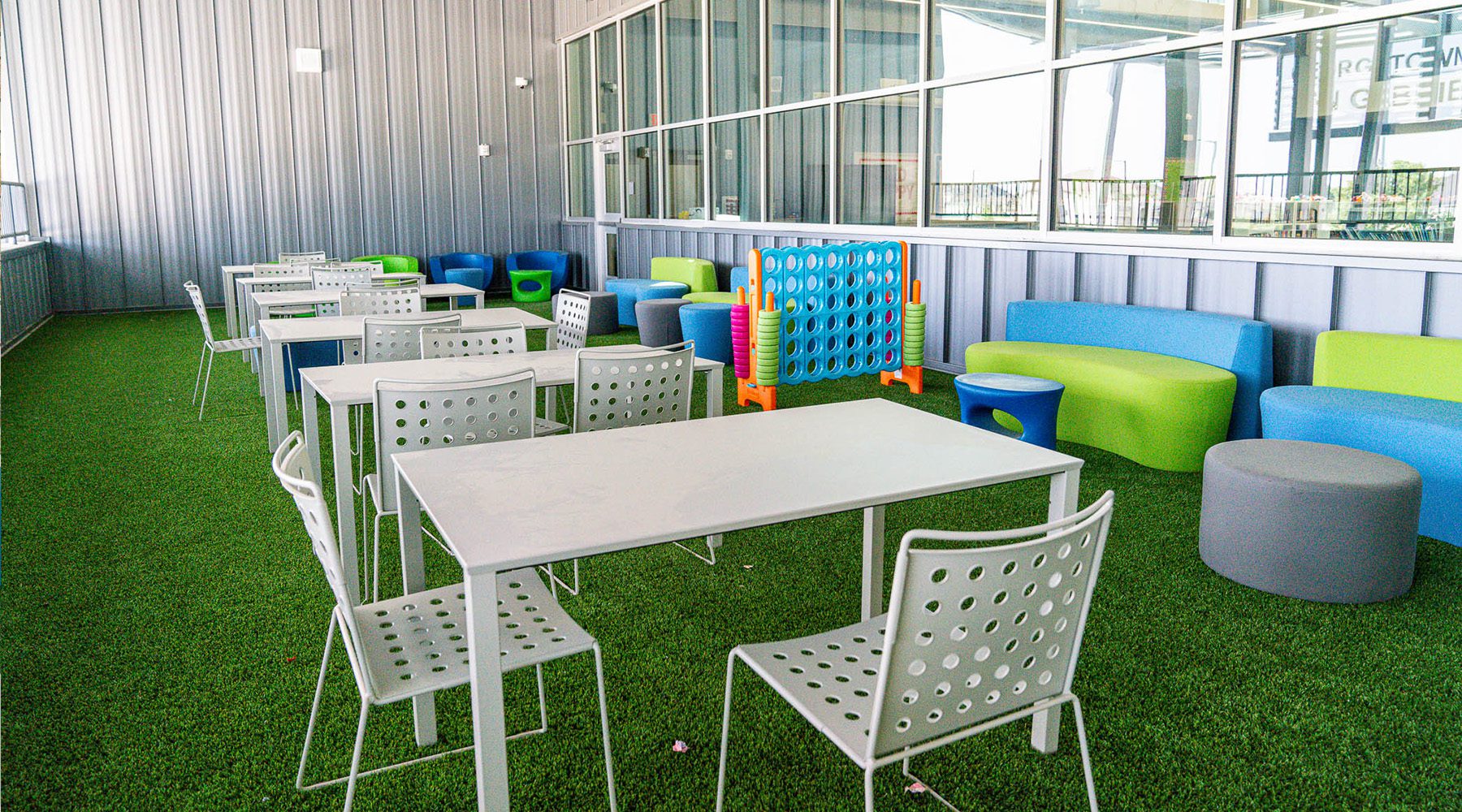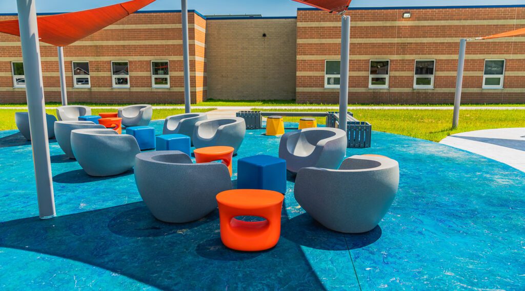Durable outdoor furniture withstands weather and provides comfortable spaces for collaborative exploration and discovery.