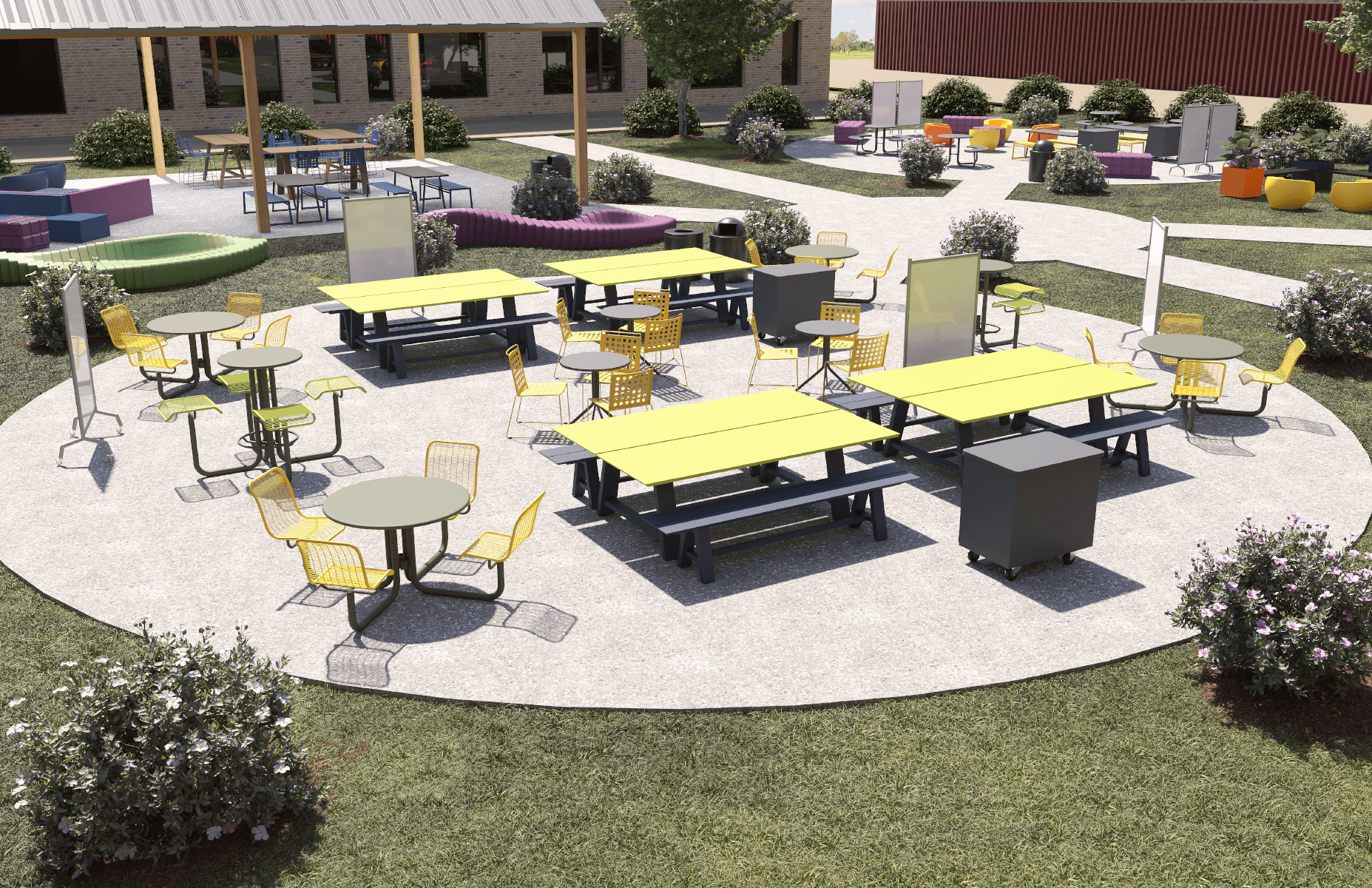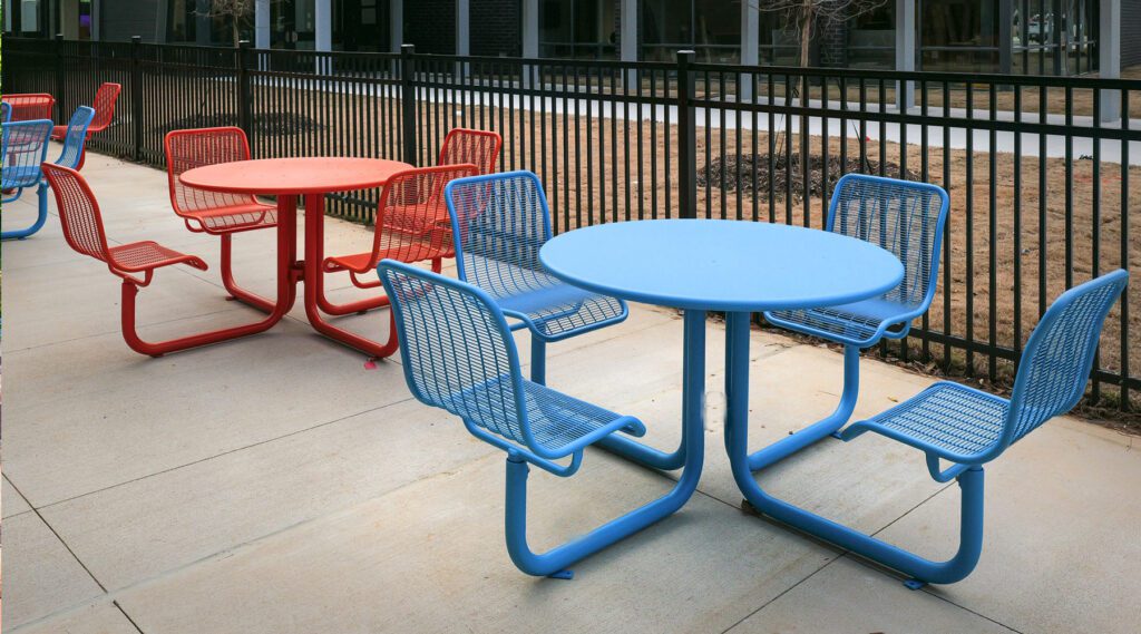 Modern picnic tables and benches offer reliable outdoor workspace for group projects and interdisciplinary activities.
