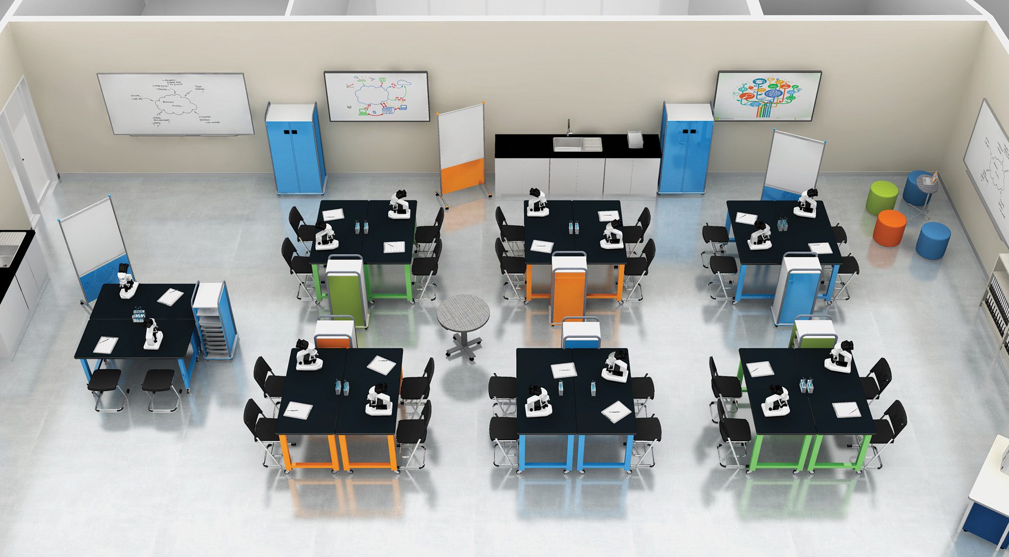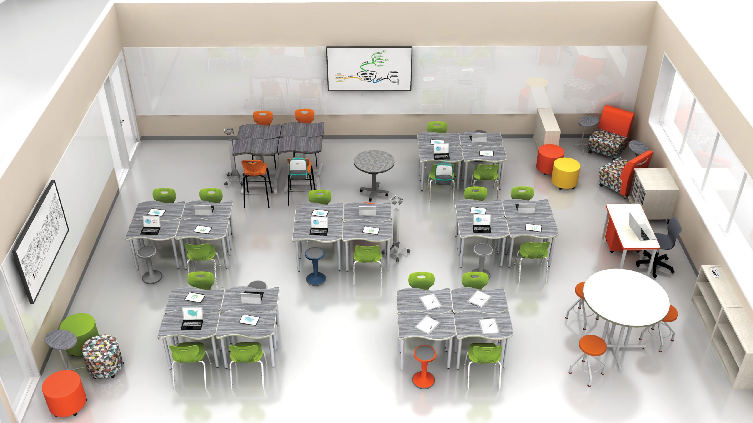 D-shaped tables enhance synergy while providing shared work surfaces for authentic problem-solving experiences.