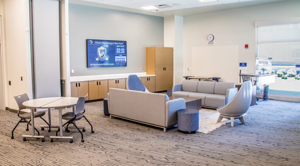 Comfortable lounge seating and work tables create spaces for teachers and staff to engage with peers.