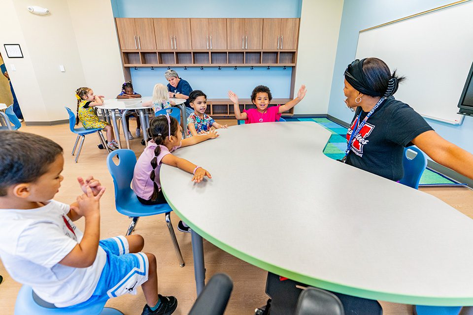 Small group tables with accessible storage create clearly defined workspaces that support individualized learning goals.