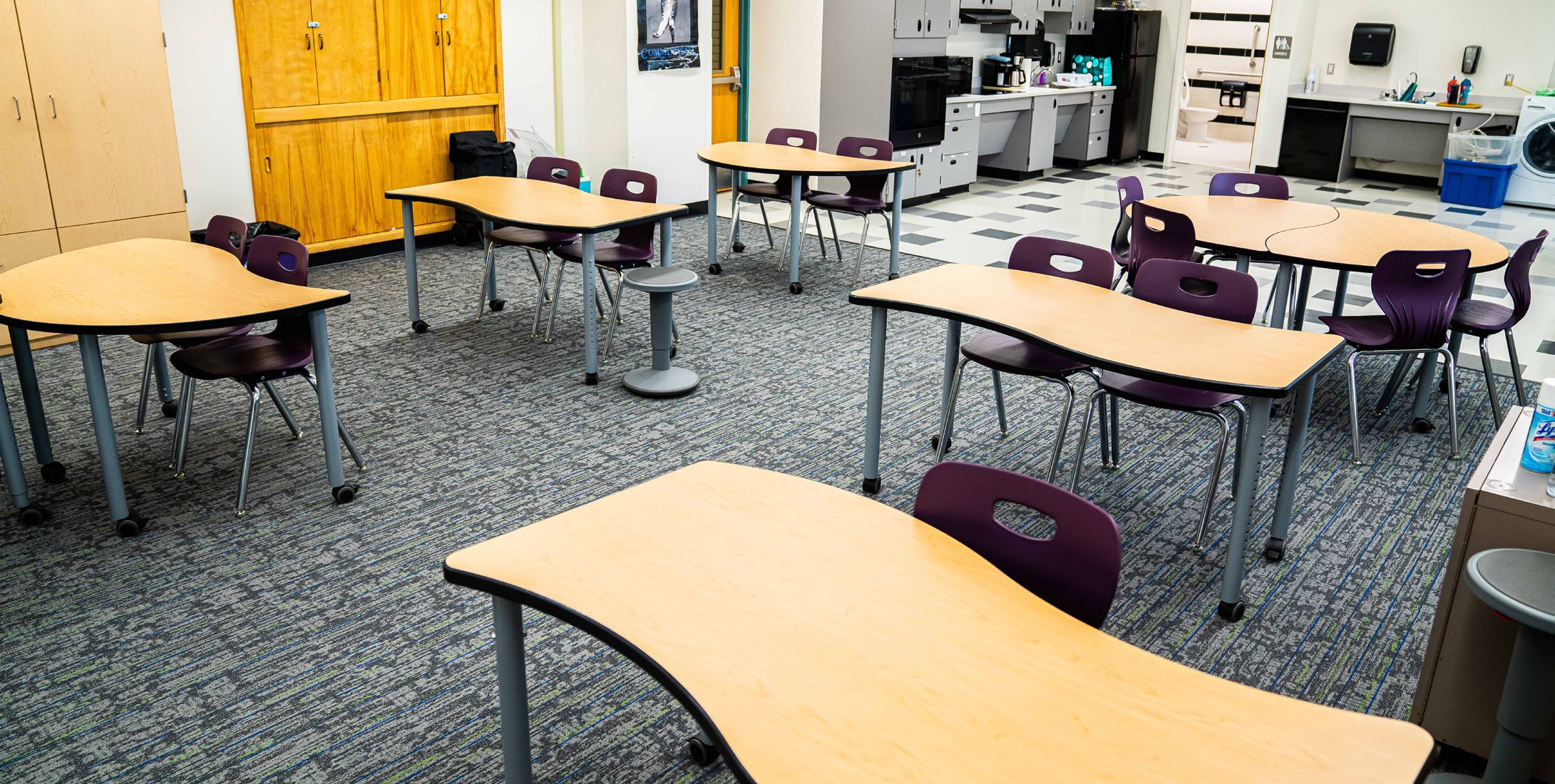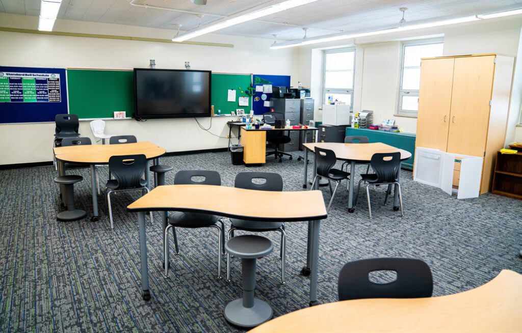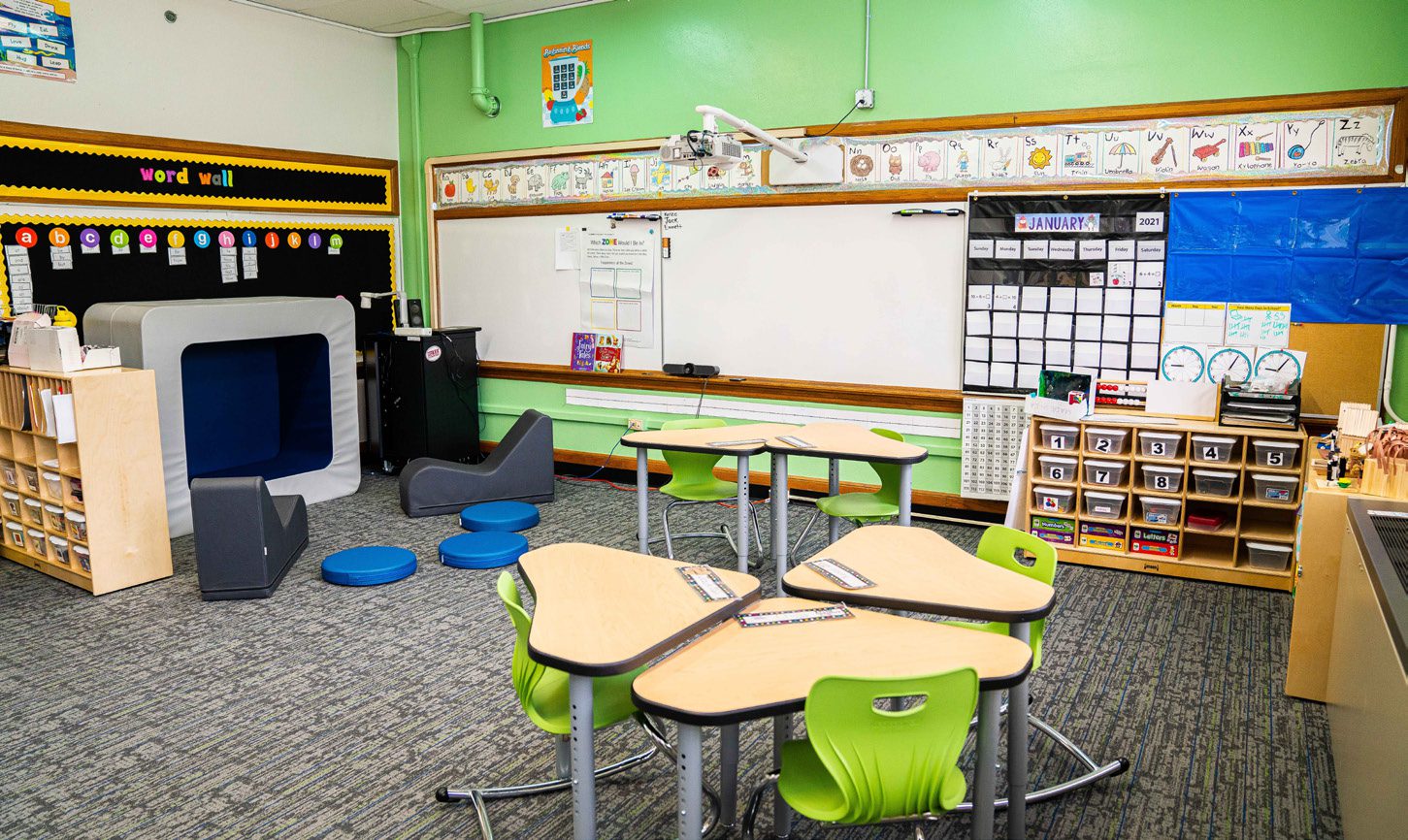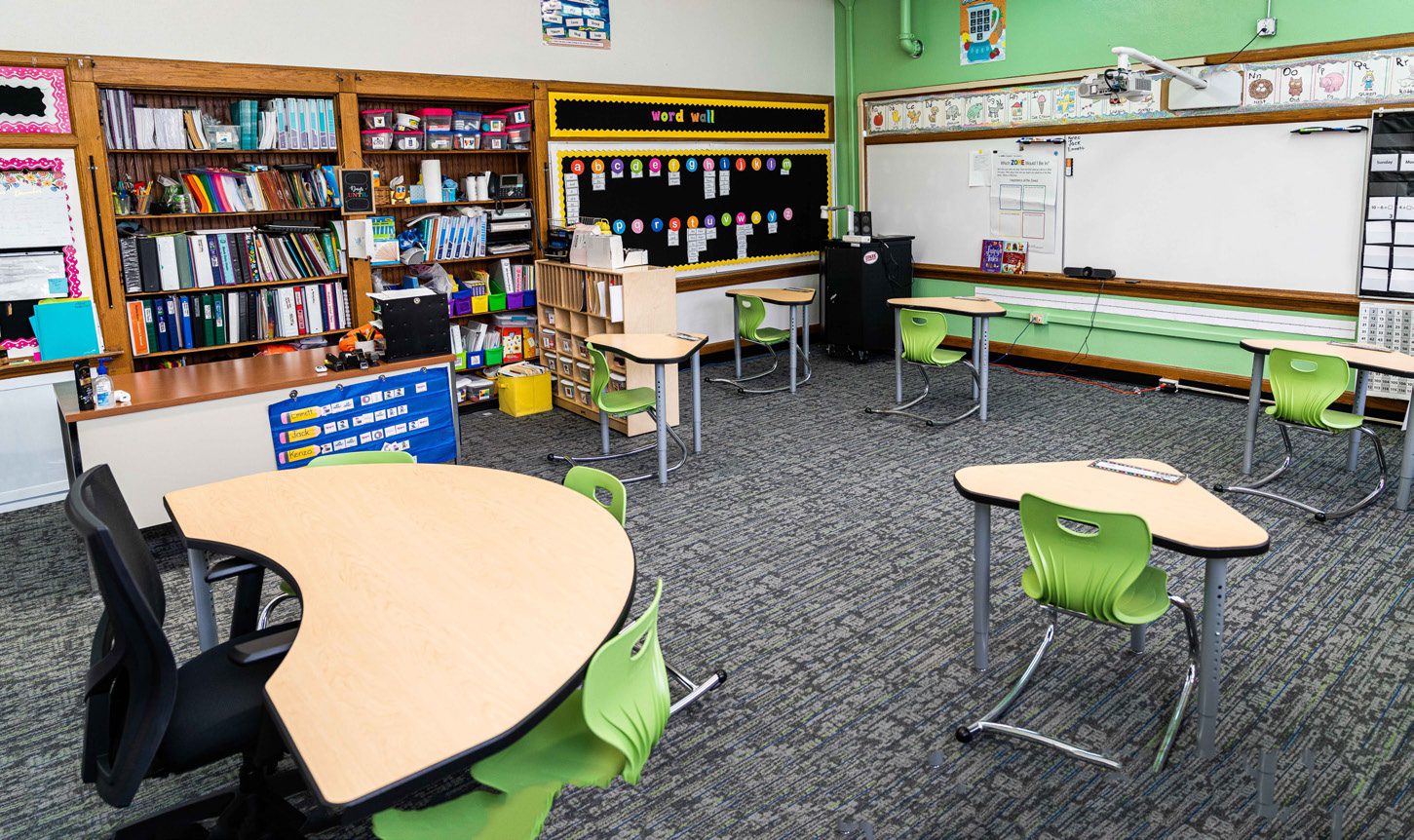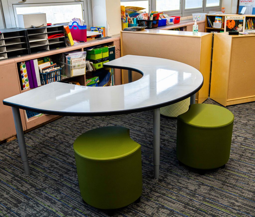 Multiple seating options and flexible arrangements allow teachers to create learning pods and maintain visual structure.
