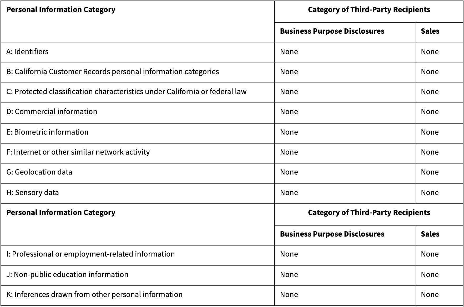 - disclosures for a business purpose, identifying the personal information categories that each category of recipient obtained.
